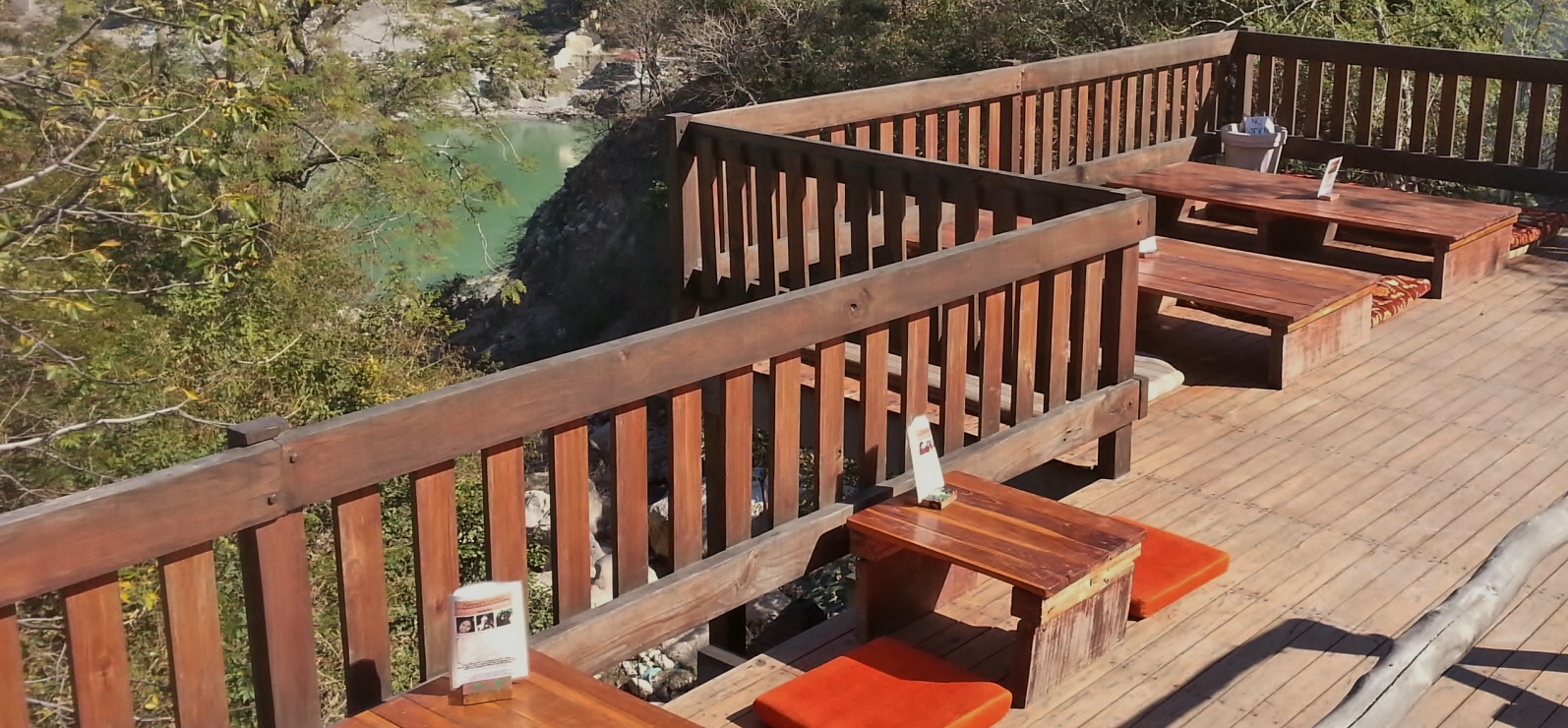 Our cafe, opened in 2006, provides customers with a relaxing atmosphere. On warm sunny days you can lounge on the upstairs patio, situated above the Ganges River overlooking both the holy river and a bubbling creek surrounded by flowers and trees. On chilly winter days the fireplace is ablaze providing a warm abode to relax and read a book with a cup of warm Masala Chai.